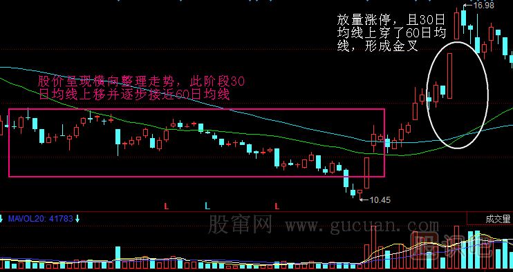 從圖中可以看出,該股先是出現(xiàn)了持續(xù)一段時間的橫向整理然后股價開始緩慢上漲,隨后在橢圓區(qū)域股價強勢放量漲停,且30日均線已經上穿了 60日均線,由此發(fā)出了金叉買入信號,其后期走勢看漲。