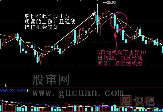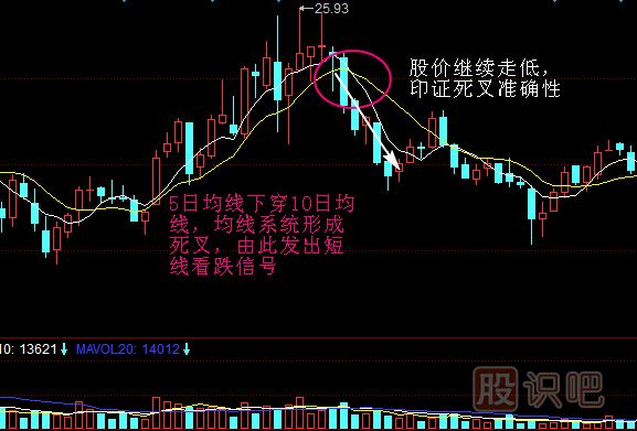 從圖中可以看到,該股從高處的25.93元持續(xù)下跌至20元附近,下跌幅度達到了20%以上,由此印證了均線死叉信號的準確性,短線投資者若不及時拋出股票必將慘遭損失。