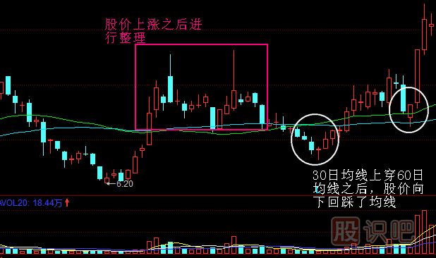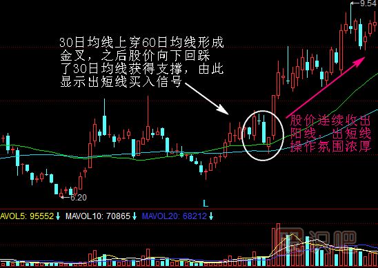 2、在股價一般性上漲,同時30日均線和60日均線形成金又時,一般會回踩30日均線,在股價回踩30日均線時即可買入。