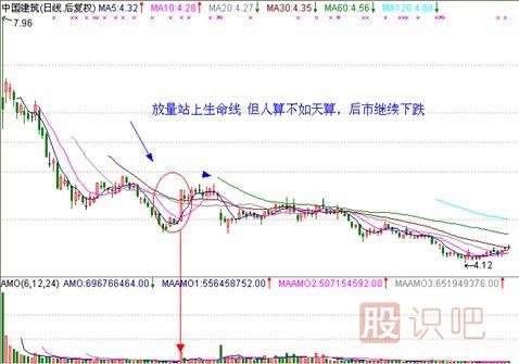 601668,中國(guó)建筑,2009年10月14日,股價(jià)也是放量站上生命線,但很可惜,后期中國(guó)建筑沒有發(fā)動(dòng)上漲行情,后來證明這僅是下跌途中的一次反彈。問題出在哪里?當(dāng)時(shí)中國(guó)建筑上市因大盤不好,這個(gè)倒霉孩子上市當(dāng)日就破發(fā),上市后繼續(xù)下跌,股價(jià)在跌至4.8元附近,攻擊線和操盤線也已經(jīng)走平開始向上,當(dāng)時(shí)的游資或者說敢死隊(duì)以為股價(jià)見底,悍然發(fā)動(dòng)了突襲,股價(jià)2009年10月14日直封漲停,但中國(guó)建筑是個(gè)基金重倉(cāng)股,很明顯游資的所為讓基金感覺到了股價(jià)的異動(dòng),隨后幾日并未配合游資拉升,當(dāng)時(shí)游資選擇中國(guó)建筑也有失策的地方,這個(gè)股票盤子太久,啟動(dòng)資金需要的太多,后市我估計(jì)明顯是游資資金鏈斷裂再也無力拉升,而資金則是通過繼續(xù)大幅殺跌把游資絞殺了。