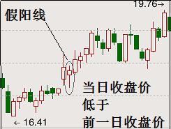 當天K線為陽線時,并不意味著股價比前一天漲了,只是表示當天收盤價高于當天開盤價。如果出現(xiàn)上述情況,那么這樣的K線稱為假陽線,陰線也有相同情況,稱為假陰線。(圖三)