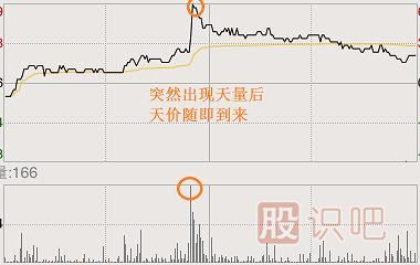 股價持續(xù)下跌(跌勢)時某日尾市放巨量,乃恐慌性拋售所致,是大盤將跳空而下的訊號。