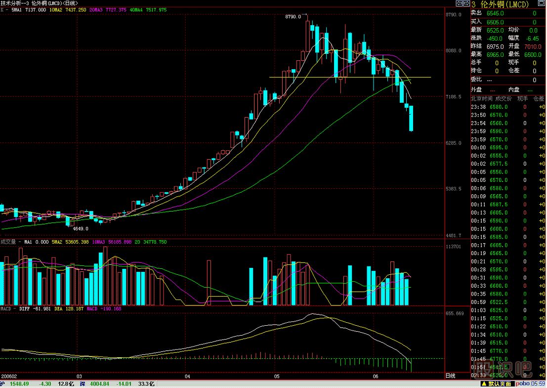2006年6月13日編輯本文時(shí),期貨倫外銅LMCD日K線圖已跌得面目全非(圖268-2),滬深兩市的“有色金屬”股也有巨大跌幅,慘重?fù)p失,初跌形態(tài)就是一門“空方炮”!
