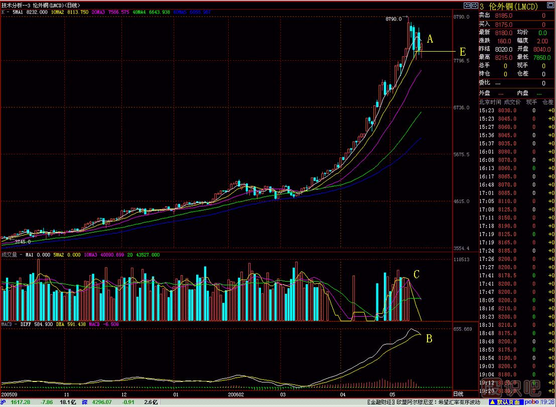 “兩陰夾一陽”圖形平時(shí)也常有出現(xiàn),但首日跌、次日漲、第三日跌的盤整行情,并非是“空方炮”。只有在暴漲行情之后,股價(jià)有了幾倍的上升,此時(shí)出現(xiàn)“兩陰夾一陽”,極可能是“空方炮”。如兩條陰線是長陰線,而且放出巨大陰量,出現(xiàn)“空方炮”的可能性更大。圖中E處是“空方炮”的炮口,以后幾天如跌破炮口線E,則“空方炮”開炮,多方將受到強(qiáng)烈的炮擊。多方由于獲利盤獲利太多,必定有壓價(jià)出逃,如此多翻空,空頭的力量越來越大。而新開的空倉量一旦增加,對(duì)多方的打擊更大。圖中A、C和B都在形成死亡交叉,有形成“三死叉見頂”形態(tài)的趨勢,這將是倫外銅見頂?shù)拿鞔_信號(hào)。因此,滬深兩市中的銅類股票也該見頂了,包括“有色金屬”股也該收斂了,別“色膽包天”喲!