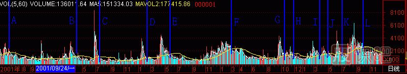 第二步實(shí)驗(yàn),把以上成交量柱體圖上方的相對應(yīng)的K線圖掛出來,看看“黑洞”拉出來的“天線”指向K線的頭部還是底部?還是其它部位?觀察“黑洞”是否“吞噬”一切靠近它的“能量”?做多力量被“吞噬”后,股價能不能上升了?可怕的股價頭部是不是形成了?每一個“黑洞”是不是對應(yīng)每一個股價頭部?