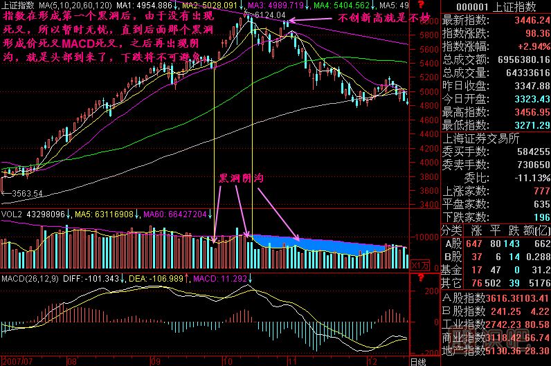 需要強(qiáng)調(diào)的是,在成交量形成黑洞之后,如果股價同步形成死叉或者價壓,則頭部下跌已經(jīng)不可避免。