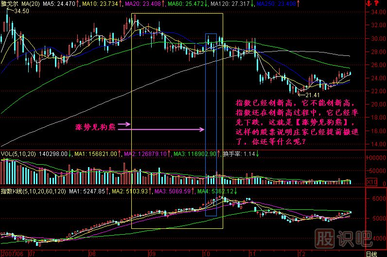第一,指數(shù)走得很強(qiáng)你卻不漲,那就說(shuō)明你在出貨,對(duì)不對(duì)?如果里邊的莊家想要做一個(gè)大行情,那指數(shù)漲的時(shí)候股價(jià)就應(yīng)該水漲船高,呼風(fēng)喚雨地往上拉,怎么會(huì)出貨呢?肯定是這個(gè)股票出了什么問(wèn)題,我這樣分析有沒(méi)有道理?因此說(shuō),漲勢(shì)見(jiàn)狗熊跟我們?cè)瓉?lái)說(shuō)的跌勢(shì)見(jiàn)英雄正好相反,在指數(shù)大跌的時(shí)候那些會(huì)漲的紅頭股票就是英雄,在指數(shù)大漲的時(shí)候那些會(huì)跌的綠頭股票就是狗熊,應(yīng)該堅(jiān)決出貨!