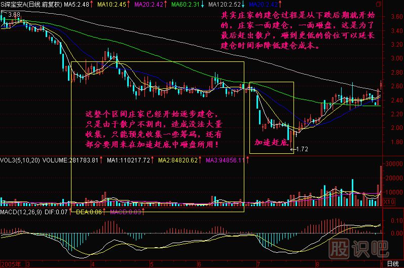 小結(jié):加速趕底是莊家建倉常用的招數(shù),莊家預(yù)先收集一點籌碼,之后可以用部分籌碼來砸盤,制造加速趕底的走勢,加速趕底之前往往有一個小平臺橫盤,散戶原本還打算持股觀望的,但突然向下快速突破,散戶終于在最后的恐慌中拋出了籌碼。