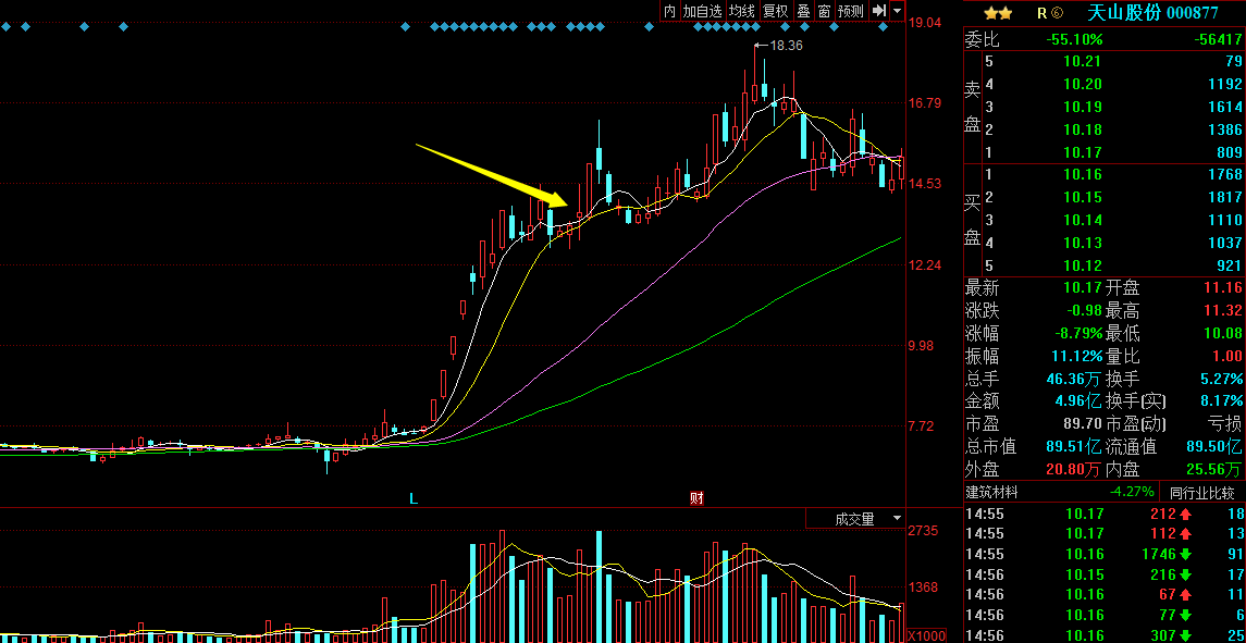 天山股份2017/2/28,天山在高位的時候,呈現(xiàn)震蕩趨勢,但并沒有收出明顯的見頂K線組合,所以在十日線附近的時候,相對其他個股,更強(qiáng)勢一些。