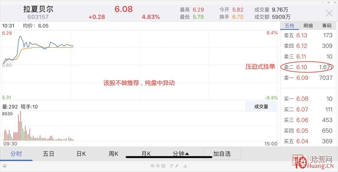 因為此時的壓單并不一定是有人在拋空,有可能是主力自己的籌碼。主力在造量,在吸引投資者注意。如果持續(xù)出現(xiàn)賣單掛出就被吃掉,那可反映出主力的實力。但大家要注意,如果想介入,千萬不要跟風(fēng)追買賣盤。等待大拋單不見了,股價在盤中回調(diào)時再介入,避免當(dāng)日追高被套。