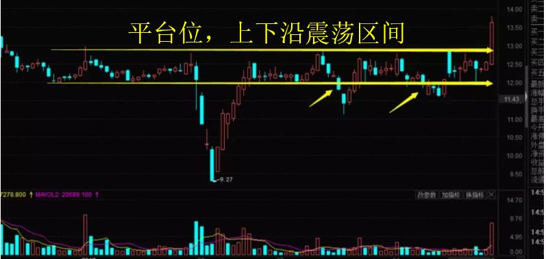 各位看上面這張圖,很明顯,莊家在前期的平臺位附近繼續(xù)震蕩洗盤。圖中長的兩個箭頭區(qū)間就是震蕩區(qū)間。