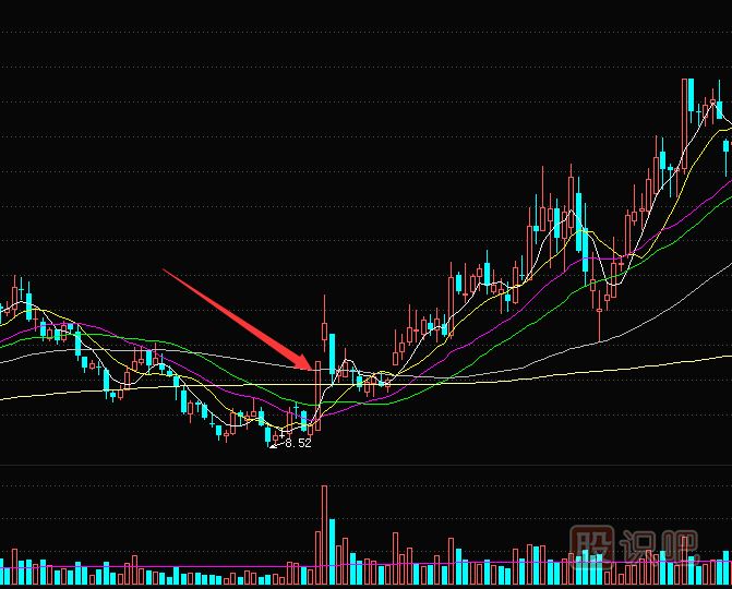 圖8-9 一陽穿多線漲停大家知道,均線不但代表著趨勢的方向,也代表著市場的成本。當(dāng)一根均線上破多條均線的時(shí)候,該股的成本就與上穿的這些均線對應(yīng)的時(shí)間股票的成本接近了。