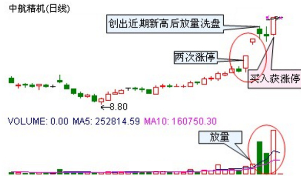 三、短線強(qiáng)力吸盤后,股價(jià)再度翻身向上時(shí)買入。一只股票的拉升,通常不會(huì)一蹴而就。一方面,短線資金會(huì)有較強(qiáng)的獲利出局意愿,制約了股價(jià)的進(jìn)一步走高;初論漲停板回踩買入的技術(shù)另一方面,主力也清洗浮籌,為后續(xù)拉升做準(zhǔn)備。而股價(jià)再度翻身向上,則說明短線洗盤結(jié)束,新的拉升就此展開,兔寶寶和中航精機(jī)基本都是這樣的走勢(shì)。