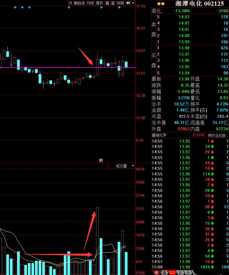如果具備以上條件說明,大陽線的當(dāng)天是主力的主要成本區(qū),而且在高位放量,證明主力成本較高。那么我們可以大概在集中放量的價(jià)位畫一個(gè)線,如示例圖的紫色線,這根線就是主力的成本線。一般操盤手不怎么喜歡自己賬面浮虧,所以一般會(huì)在收盤前把價(jià)位拉回去。