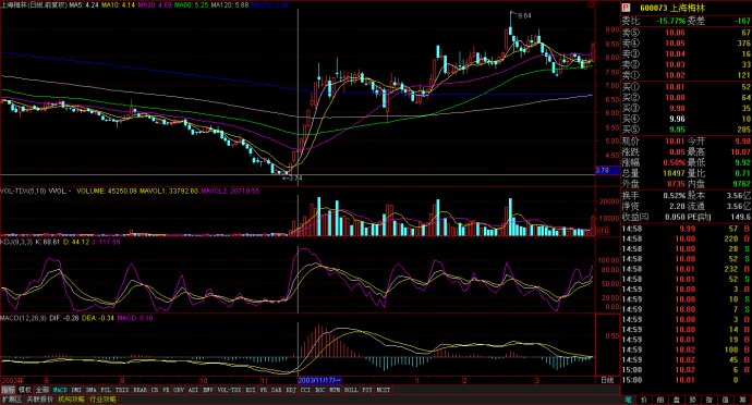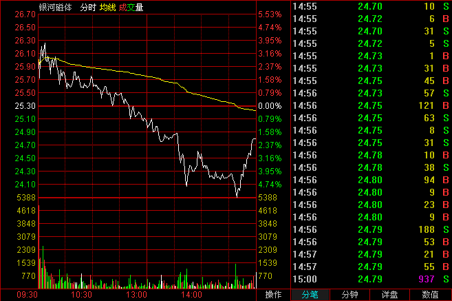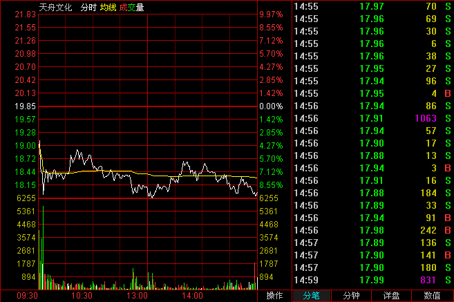 破位大陰線分時(shí)圖:開(kāi)盤(pán)低開(kāi)低走。然后全天保持箱型震蕩,收盤(pán)幾乎收在全天最低價(jià)。兩個(gè)細(xì)節(jié)引起注意:尾盤(pán)出現(xiàn)了一個(gè)大買(mǎi)單;最后一分鐘收盤(pán)價(jià)從17.9收到了17.99元。