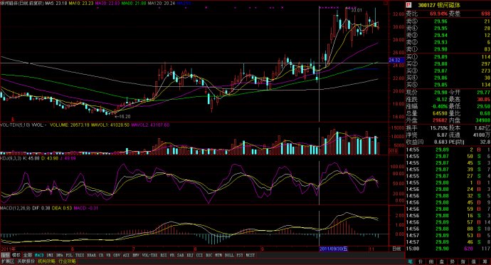 銀河磁體:十字線處出現(xiàn)了一根一字漲停線。前晚三季報(bào)出現(xiàn)了100%的增長(zhǎng)。第二天順勢(shì)高開(kāi),并且高開(kāi)在前一根波峰處,第三天接勢(shì)洗盤(pán)。第四天低開(kāi)高走,封漲停。