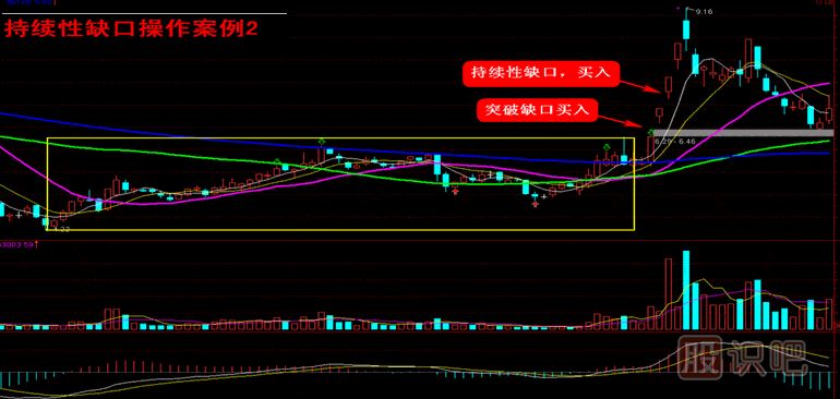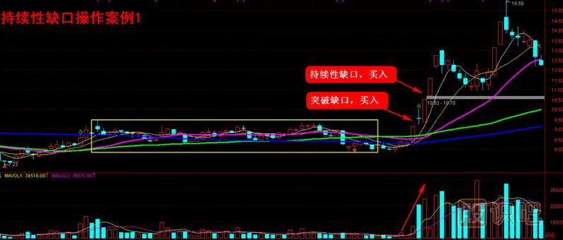 就持續(xù)性缺口的操作而言,投資者可以在出現(xiàn)持續(xù)性缺口后做出買入或者賣出決策,當(dāng)方向向上時買入,此時同樣需要成交量的放大來對價格進(jìn)行驗(yàn)證(漲停板模式除外);反之,方向向下時賣出。