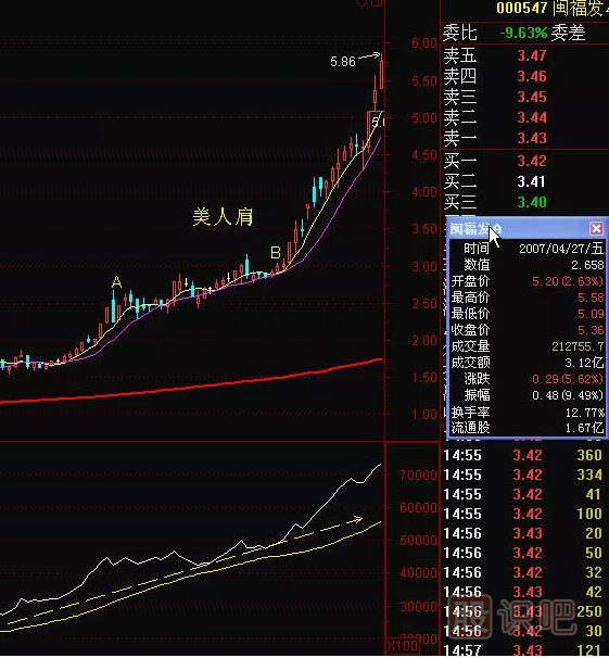 股價(jià)在第一波放量建倉之后,往往進(jìn)入縮量洗盤階段,這個(gè)時(shí)候個(gè)股將出現(xiàn)分化,對(duì)于那些弱莊股將出現(xiàn)回檔較深,5、10日均線死叉的情況,而有相當(dāng)少部分的股票會(huì)出現(xiàn)股價(jià)并不下跌,縮量盤整或盤升的狀態(tài),這個(gè)時(shí)候5、10日均價(jià)線保持通氣,只要能量注入,成交量放大,股價(jià)向上突破,這就構(gòu)成了【美人肩】了。