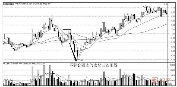 不少投資者往往簡(jiǎn)單地根據(jù)技術(shù)形態(tài)來下定義,他們認(rèn)為,底部三連陽線是指股價(jià)出現(xiàn)了連續(xù)三根陽線的技術(shù)形態(tài)。圖3-15展示的就是不符合要求的底部三連陽線形態(tài)。在實(shí)際操作中,底部三連陽線形態(tài)的形成需要以下幾個(gè)方面的特征同時(shí)出現(xiàn)。