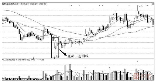 投資者應(yīng)該知道,底部三連陽線是屬于一種相對(duì)溫和的見底反彈信號(hào),它不具有突發(fā)性和爆發(fā)性,不是大逆轉(zhuǎn)行情的標(biāo)志,而是前一輪較大行情之后陷入中期調(diào)整時(shí)見底的信號(hào)。