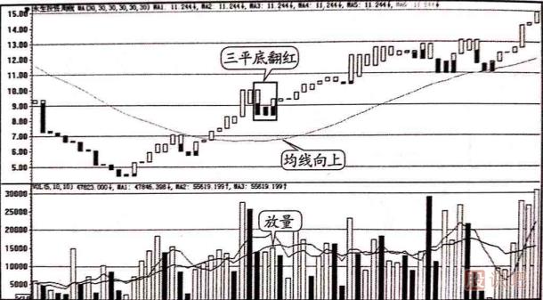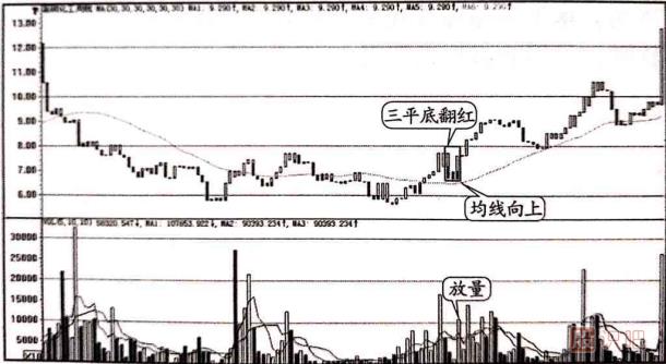 周線級別中的寶塔線三平底翻紅意味著做空能量得到了充分的釋放,股價不再下跌,只是在底部小幅波動,波動結(jié)束后,就會結(jié)束下跌,進(jìn)人上升的行情。一旦寶塔線在成交量的配合下開始翻紅,說明股價重新開始上漲,投資者應(yīng)及時果斷買入。