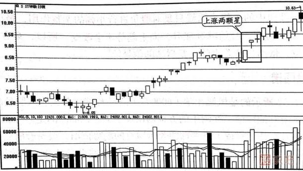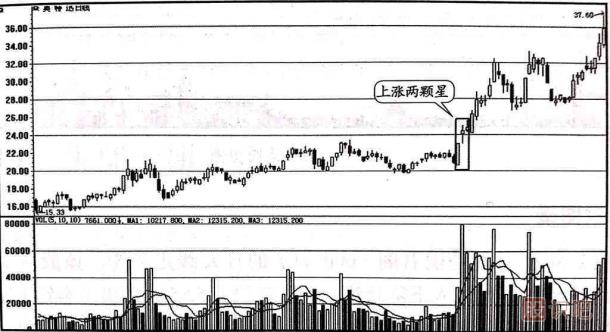 上漲兩顆星屬于常見的上漲中繼形態(tài),一般出現(xiàn)在大行情的初期。 大陽線之后連續(xù)出現(xiàn)勢均力敵的信號(hào)意味著多空雙方的力量在新的條件下取得了平衡,空方?jīng)]有打壓股價(jià)的力量,多方的勝利被鞏固了,投資者對(duì)股價(jià)的上漲已經(jīng)取得了共識(shí),大陽線取得的成果已經(jīng)得到市場的認(rèn)同,這往往是股價(jià)大幅度攀升的先兆。