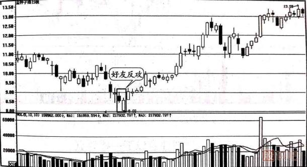 (1)好友反攻是股價震蕩探底的形態(tài),如果沒有重大利空,短期內(nèi)很難再打至低開時探出的最低價,如稍后數(shù)日內(nèi)出現(xiàn)帶量的大陽線或中陽線,即可確認反彈開始。