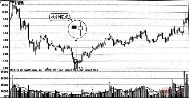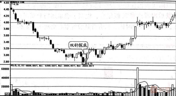 (1)雙針探底中的雙針,可以是緊密相連的兩根長下影線,也可以是中間隔有幾條K線的雙針走勢,但相隔的天數不能多于五個交易日。