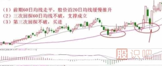 操作方法:個(gè)股在長期下跌后,股價(jià)第一次站上60均線,急進(jìn)的投資者可以跟進(jìn),穩(wěn)健的投資者可以等到股價(jià)洗盤回調(diào)到60均線附近區(qū)域得到支撐買入,極其準(zhǔn)確。