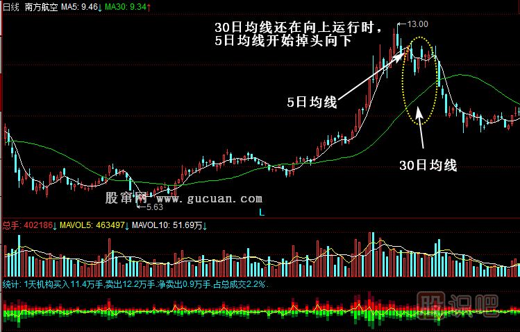 第四,當(dāng)股價處在相對的頂部區(qū)域時,如30日均線開始向下拐頭,有兩種可能,一個是洗盤,一個是出貨。如果是主力在洗盤,那么前期股價漲幅不會太大,成交量不會放大,洗盤的時間不會太長,并且股價下跌的幅度不會太深。如果股價上漲幅度過大,并且下跌幅度較深,在下跌時成交量放大,則為主力出貨。