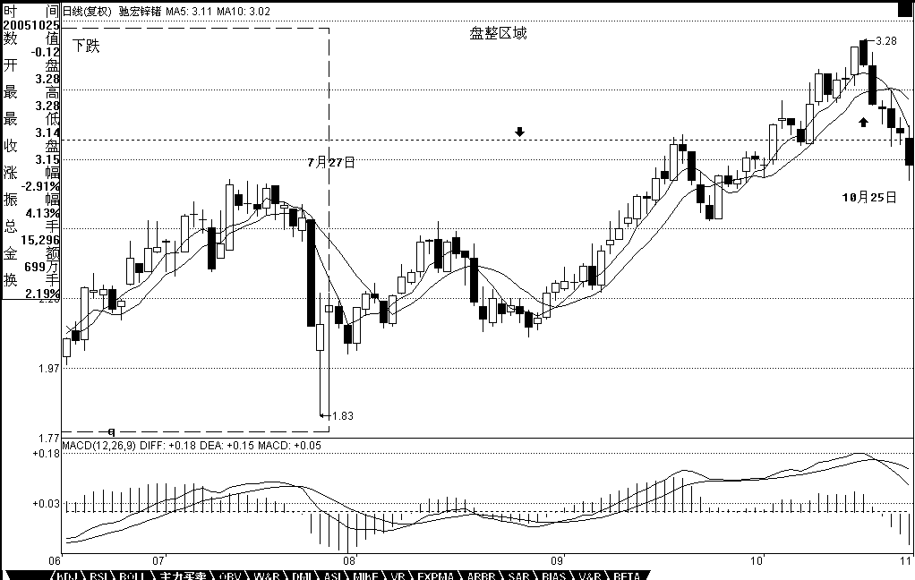 其后的上漲,對(duì)600497馳宏鋅鍺, 2005年7月27日到10月25日,明確地出現(xiàn)在日線上的上漲走勢(shì)(為什么?因?yàn)樵谌站€上明確地看到兩個(gè)CZSC走勢(shì)中樞)。而580991從2006年10月23日到12月13日,只構(gòu)成日線上的盤(pán)整走勢(shì)(為什么?因?yàn)樵谌站€上明確地看到一個(gè)CZSC走勢(shì)中樞)。(備注:580091配圖見(jiàn)前面15課后1219的回復(fù))